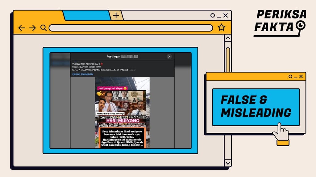 Unggahan ini dibagikan oleh akun Facebook @Alif P (arsip) pada Sabtu (7/02/2026). Dalam unggahannya, terdapat foto Jokowi dan anaknya, Gibran Rakabuming Raka, dengan Mahfud MD yang diklaim menghadirkan anak mendiang Hari Mulyono. Terdapat juga potret Hari Mulyono bersama istri dan anaknya pada tahun 1986/1987. Foto mendiang Hari Mulyono ini diklaim sama persis dengan foto ijazah SMA, ijazah UGM serta buku nikah milik Jokowi.