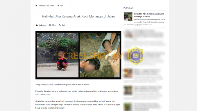 Beredar sebuah artikel yang berjudul “Hati-Hati Jika Ketemu Anak Kecil Menangis di Jalan”. Artikel ini dimuat di situs info-facebookers[dot]blogspot.com pada tahun 2015, namun tetap sering dibagikan oleh warganet hingga kini.