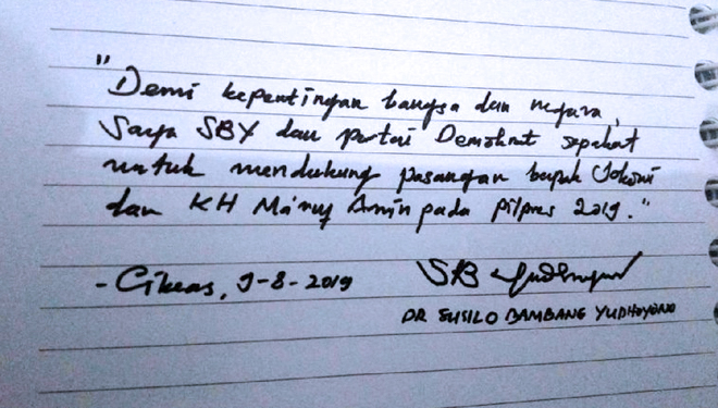 "Demi kepentingan bangsa dan negara, saya SBY dan Partai Demokrat sepakat untuk mendukung pasangan Bapak Jokowi dan KH Ma'ruf Amin pada Pilpres 2019."