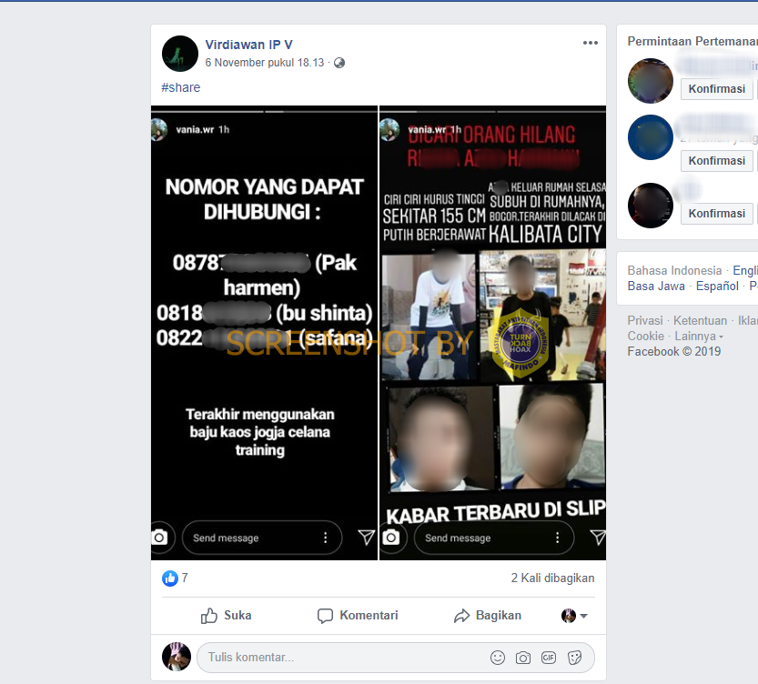 Akun Virdiawan IP V misalnya, ia membagikan tangkapan layar dari stories instagram vania.wr yang menampilkan beberapa foto RAH dan informasi tentang menghilangnya RAH.