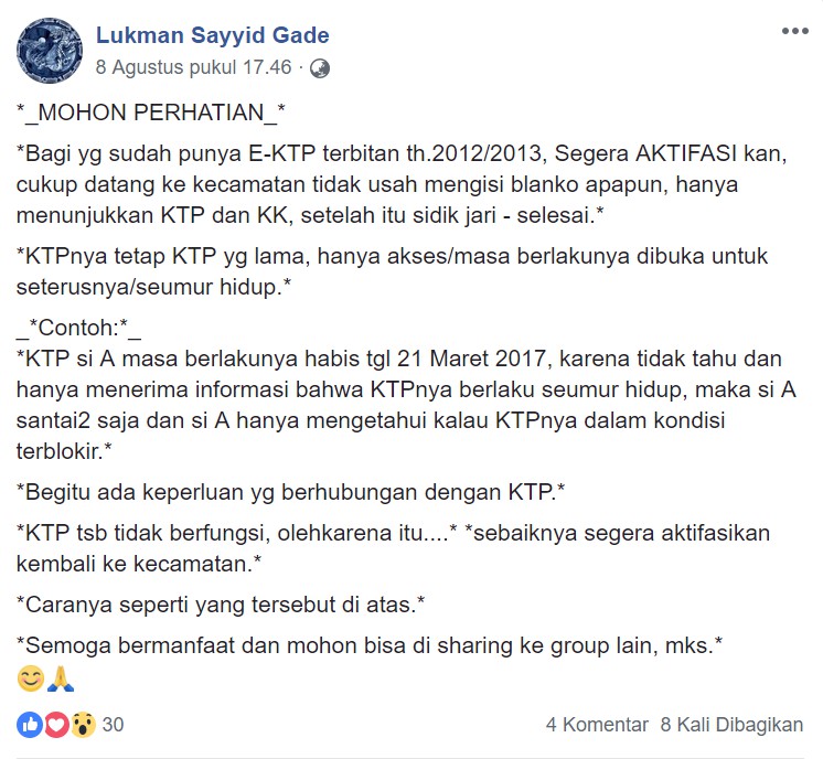 *KTP tsb tidak berfungsi, olehkarena itu....* *sebaiknya segera aktifasikan kembali ke kecamatan.*