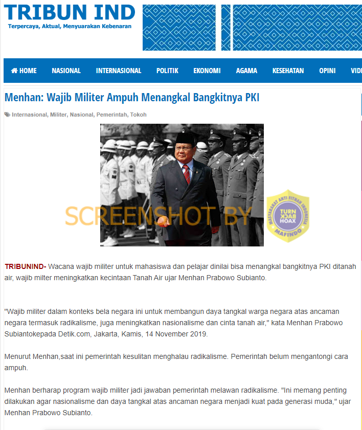 Sementara paragraf pertama artikel di blog Tribun Ind berbunyi: “Wacana wajib militer untuk mahasiswa dan pelajar dinilai bisa menangkal bangkitnya PKI ditanah air, wajib milter meningkatkan kecintaan Tanah Air ujar Menhan Prabowo Subianto.”