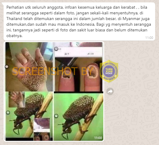 ”Perhatian untuk seluruh anggota, infokan ke semua keluarga dan kerabat, bila melihat serangga seperti dalam foto, jangan sekali-kali menyetuhnya,” bunyi pesan berantai tersebut. Menurut si pengirim pesan, orang yang menyentuh serangga itu akan mengalami kesakitan yang luar biasa. Juga, belum ditemukan obat atau penawarnya.