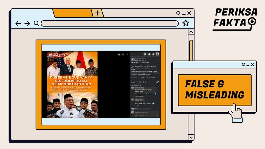 Melansir laman Cyberity, dalam pertemuan antara Gus Yahya dan Dubes AS pada Rabu (1/4/2026), tidak ditemukan pernyataan yang menyerukan masyarakat Indonesia untuk mengecam Iran. Tujuan pertemuan tersebut adalah untuk mendorong komunikasi intensif antara pemerintah AS dan Republik Islam Iran guna mengakhiri ketegangan di kawasan tersebut. Dengan demikian, narasi yang mengklaim Dubes AS bersama Gus Yahya mengajak masyarakat Indonesia untuk mengecam tindakan Iran adalah tidak benar.