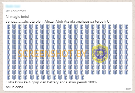 Beredar pesan berantai melalui Whatsapp yang mengklaim bahwa dengan menyebarkan emoticon baterai ke empat grup maka baterai ponsel akan terisi penuh. Dalam pesan tersebut disebutkan pula inovasi itu diciptakan oleh Afrizal Abdi Assyifa yang dikatakan sebagai mahasiswa terbaik di Universitas Indonesia (UI).