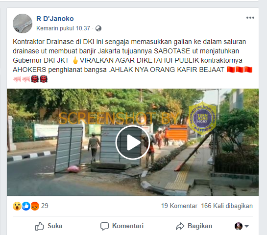 “Kontraktor Drainase di DKI ini sengaja memasukkan galian ke dalam saluran drainase ut membuat banjir Jakarta tujuannya SABOTASE ut menjatuhkan Gubernur DKI JKT VIRALKAN AGAR DIKETAHUI PUBLIK kontraktornya AHOKERS penghianat bangsa .AHLAK NYA ORANG KAFIR BEJAAT”