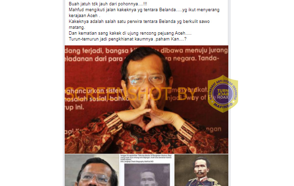 Unggahan akun Facebook Anna Prasetyo atau @dianna.debora.180 yang berisi gambar Menko Polhukam, Mahfud MD yang disandingkan bersama Bangsawan asal Bangkalan, Raden Ario Majang Koro dengan inti pesan bahwa Mahfud MD mengikuti jejak Kakeknya, Raden Ario Majang Koro dengan menjadi penghianat adalah tidak benar.