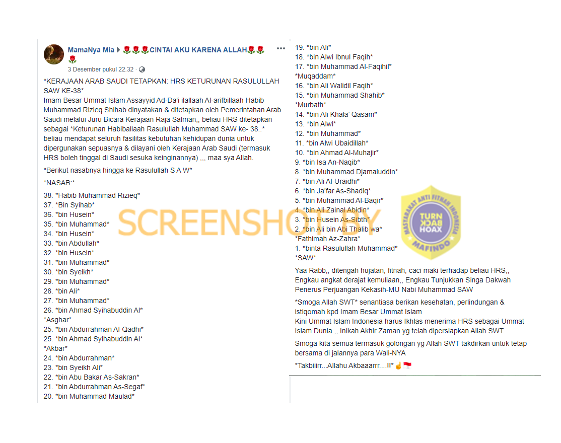 Berdasarkan penelusuran Tempo, informasi bahwa Arab Saudi menetapkan Rizieq sebagai keturunan ke-38 Nabi Muhammad mulai beredar sejak 2018. Dikutip dari situs JPNN.com, informasi itu kebanyakan bersumber dari artikel di situs Dakwah Media.