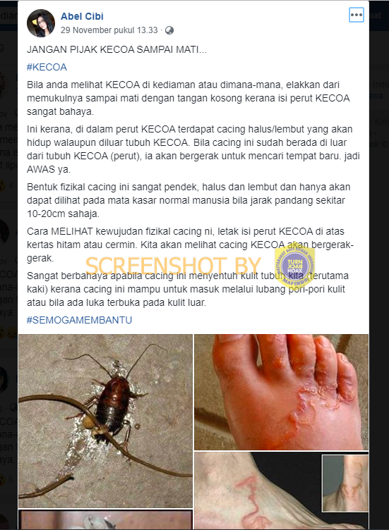Hoax lama yang kembali beredar. Pada tahun 2013 lalu dr Chabib Afwan yang menjabat sebagai Deputi Zoonosis Kementerian Koordinasi Kesejahteraan Rakyat RI menjelaskan belum pernah ditemukan cacing dari kecoa menginfeksi manusia.