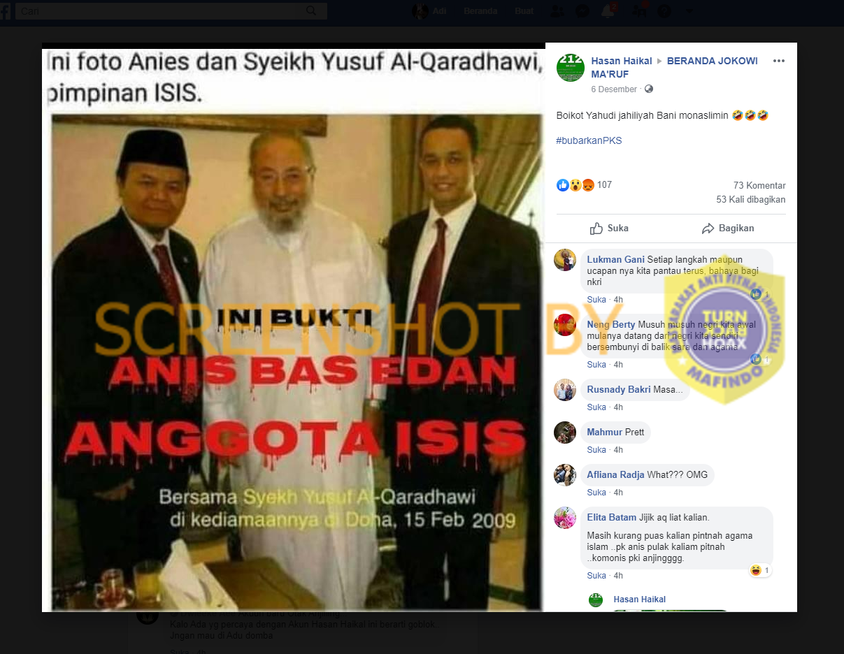 Di gambar tersebut tampak Gubernur DKI Jakarta Anies Baswedan bersama politikus Partai Keadilan Sejahtera(PKS), Hidayat Nur Wahid, serta ulama asal Mesir yang berkewarganegaraan Qatar, Yusuf al-Qaradawi. Juga narasi sebagai berikut: