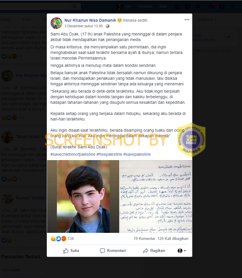 Ketika mencari tentang ‘Sami Abu Dyak’ di Google, banyak artikel berita tentang kematiannya ditemukan di hasil pencarian. Tapi, dia bukan yang ditunjukkan dalam foto dan usianya 36 tahun, bukan 17 tahun. Menurut sebuah artikel di ‘Middle East Eye’, Sami Abu Diyak ‘ menderita kanker stadium akhir dan telah ditolak cuti untuk tinggal bersama keluarganya ‘.