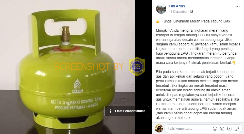Beredar kembali informasi menyesatkan perihal lingkaran merah pada tabung gas elpiji 3kg yang diklaim sebagai penanda adanya kebocoran. informasi tersebut dibagikan oleh akun facebook Fiki Arius dengan narasi yang berisi apabila warna lingkaran merah muncul, masih aman untuk melepas regulator.