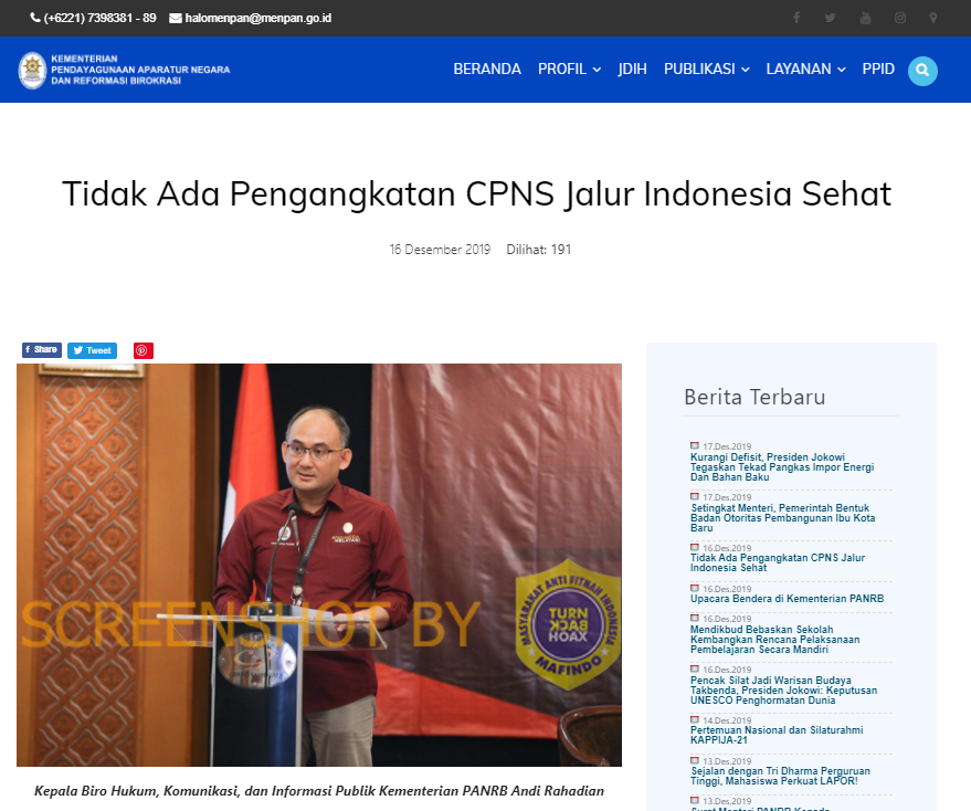 Pihak Kementerian Pendayagunaan Aparatur Negara dan Reformasi Birokrasi (Kemenpan RB) pun angkat bicara lantaran sudah masuk laporan kepada instansinya. Kepala Biro Hukum, Komunikasi, dan Informasi Publik (HKIP) Kemenpan RB, Andi Rahadian menegaskan, Kemenkes tidak memiliki program pengangkatan CPNS Jalur Indonesia Sehat.