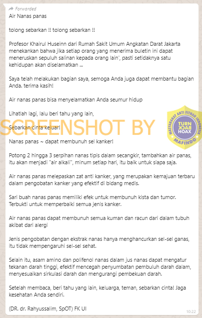 Beredar pesan berantai yang menyebutkan bahwa air nanas panas dapat menyembuhkan dari penyakit kanker. Dalam pesan berantai itu disebutkan sumber pesannya berasal dari DR. dr. Rahyussalim, SpOT dari Fakultas Kedokteran Universitas Indonesia (FK UI).