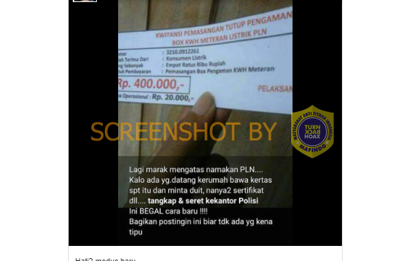 Pada media sosial Facebook, beredar kabar adanya oknum yang mengatas namakan Perusahaan Listrik Negara (PLN) yang meminta uang dalam jumlah tertentu sebagai biaya untuk pemasangan tutup pengaman box KWH meteran listrik.Setelah ditelusuri, kabar tersebut di atas bukanlah hal yang baru. Tetapi sudah berulang dan juga pernah ditayangkan oleh warganet lainnya, seperti di tahun 2018, 2017 dan 2016. Dilansir dari Kompas.com, peristiwa serupa nyatanya pernah terjadi juga pada 2013.Diketahui Vice President Corporat Communication and CSR PLN, Dwi Suryo Abdulah telah membantah kabar yang beredar di media sosial tersebut. Ia menyatakan PLN tidak memperdagangkan apa pun kecuali listrik.”Kami pastikan PLN tidak pernah menjual apa pun kecuali jualan listrik atau stroom,” kata Dwi, Selasa (17/12).Jika ada oknum atau pihak yang mengatasnamakan PLN dan mendatangi rumah dan meminta sejumlah uang, dapat dipastikan itu adalah modus penipuan dan bukan resmi berasal dari PLN. “Jadi kalau ada yang menawarkan kotak meteran saya pastikan itu bukan dari PLN. Hati hati saja dengan penawaran yang aneh aneh,” tegas Dwi. Oleh karena itu, masyarakat tidak perlu menanggapinya. Jika ada pertanyaan atau keluhan yang ingin disampaikan pada PLN, masyarakat bisa langsung menghubungi Call Center PLN di nomor 123, baik telepon (tambahkan kode area) maupun WhatsApp. Bisa juga melalui Twitter @pln_123, Facebook PLN 123, atau e-mail pln123@ pln.co.id.