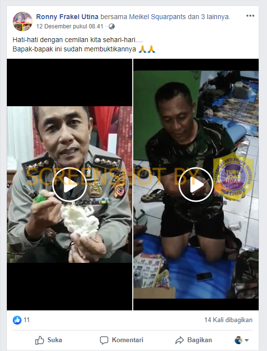 Video pertama menampilkan seorang pria dengan seragam Polri membakar kerupuk berwarna putih dan video kedua menampilkan seorang pria dengan baju kaus loreng membakar produk Crispy Crackers.
