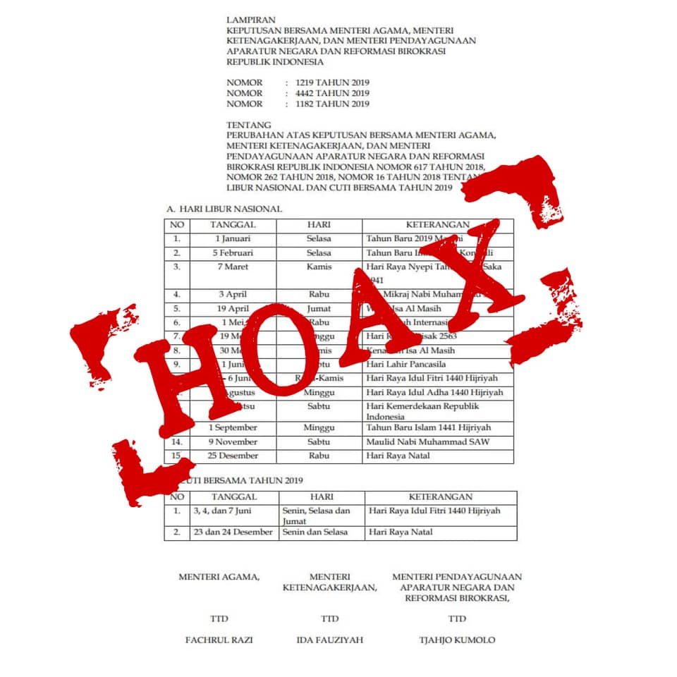 Beredar sebuah surat Keputusan Bersama yang mengatasnamakan Menteri Agama Fachrul Razi. dalam surat yang beredar tertulis bahwa cuti bersama Hari Raya Natal jatuh pada tanggal 23-34 desember 2019.
