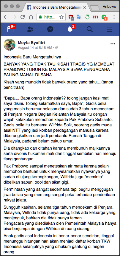 Peristiwa di 2013 yang diangkat kembali, "Organisasi yang peduli advokasi TKI, Migrant Care menyatakan sangat menyesalkan klaim capres Prabowo Subianto tentang pembebasan Wilfrida Soik, yang dinilainya sebagai buah karyanya secara eksklusif.". Selengkapnya di bagian PENJELASAN dan REFERENSI.