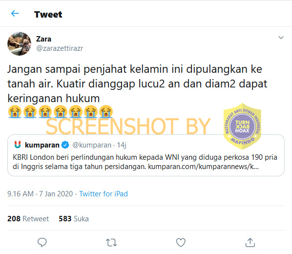 Beredar sebuah tweet yang dibuat oleh akun @zarazettirazr di Twitter. Tweet tersebut telah mendapat 222 retweet dan 608 suka per 7 Januari 2020 pukul 13.56. Tweet tersebut mengutip berita dari Kumparan yang berjudul KBRI London Beri Perlindungan Hukum Bagi Reynhard Sinaga.