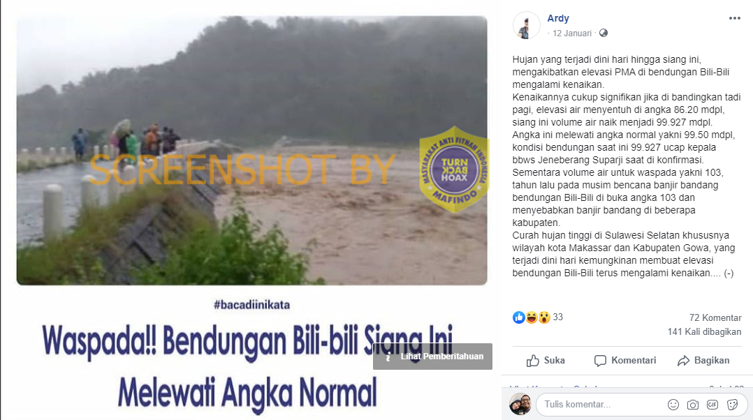 Melalui hasil penelusuran, diketahui bahwa informasi tersebut tidak benar. Sebab, pada tanggal 12 Januari 2020, pihak Balai Besar Wilayah Sungai Pompengan Jeneberang (BBWJPS) sudah membantahnya.