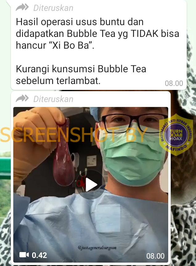 Beredar video yang memperlihatkan organ dalam dengan benda bulat berlendir berwarna kehitam-hitaman. Pada narasi yang menyertai video itu disebutkan bahwa video itu merupakan hasil operasi usus buntu yang berisikan Boba. Berikut kutipan narasinya: