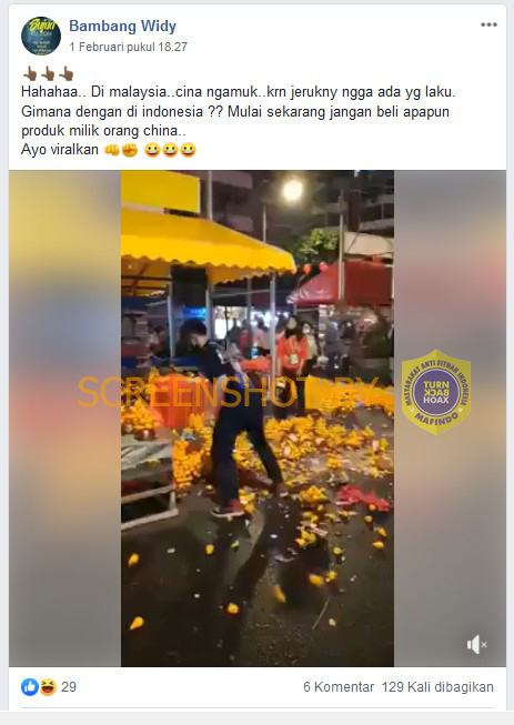 Beredar sebuah postingan yang dibuat oleh akun Bambang Widy di Facebook. Postingan tersebut memuat konten berupa sebuah video yang diklaim menggambarkan kemarahan pedangang Cina di Malaysia karena jeruknya tidak laku akibat wabah virus Corona. Per 3 Februari 2020 pukul 12.02, postingan tersebut telah ditanggapi sebanyak 29 orang dan dibagikan sebanyak 129 kali. Berikut kutipan narasinya: