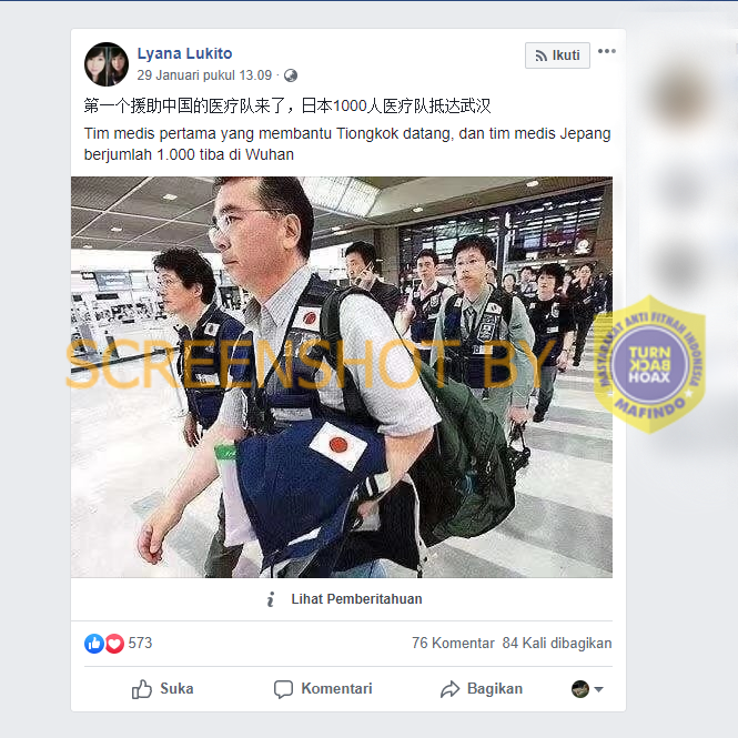 Berdasarkan hasil penelusuran, bahwa foto dalam unggahan tersebut tidak ada kaitannya dengan wabah Virus Corona 2019-nCoV yang bermula di Wuhan, China. Foto yang diunggah oleh sumber klaim adalah anggota tim medis Jepang yang berangkat ke kota Chengdu di Cina setelah terjadinya gempa di tahun 2008.
