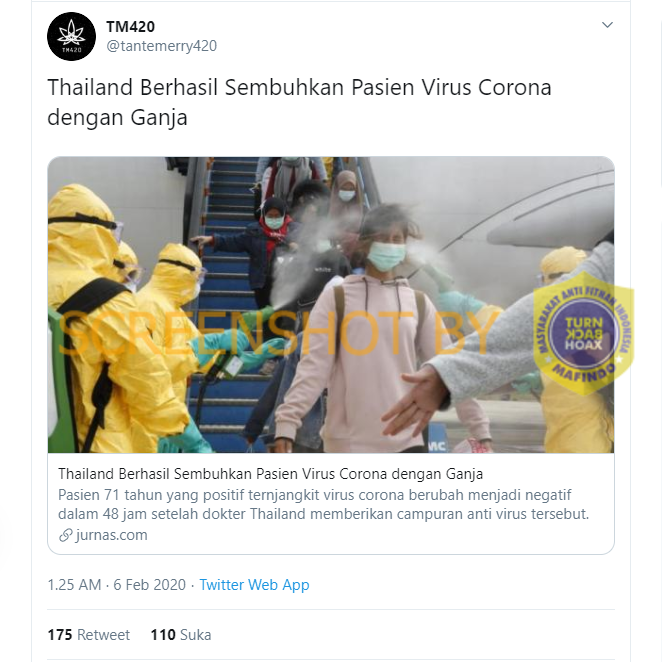 Beredar artikel dengan judul : “Thailand Berhasil Sembuhkan Pasien Virus Corona dengan Ganja”. Artikel ini dimuat di situs jurnas[dot]com pada Senin, 03 Februari 2020.