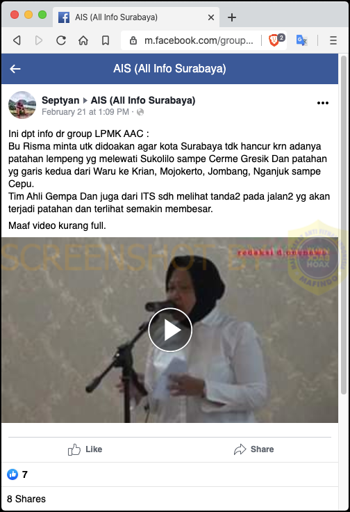 Bu Risma minta utk didoakan agar kota Surabaya tdk hancur krn adanya patahan lempeng yg melewati Sukolilo sampe Cerme Gresik Dan patahan yg garis kedua dari Waru ke Krian, Mojokerto, Jombang, Nganjuk sampe Cepu.