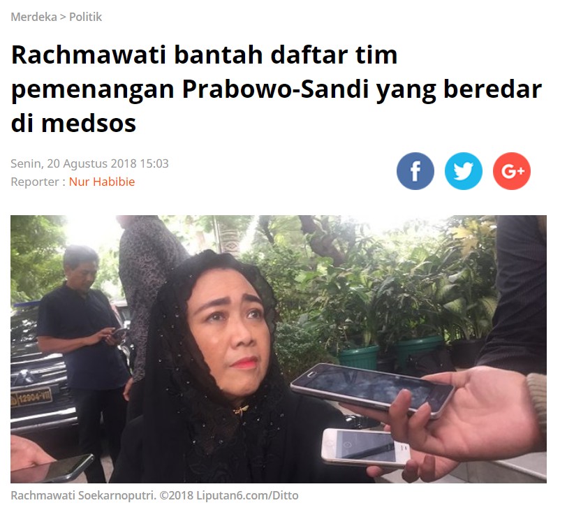 Atas beredarnya nama-nama yang diklaim akan menjadi bagian dari tim kampanye/pemenangan Pasangan Calon Presiden (Capres) dan Calon Wakil Presiden (Cawapres) Prabowo Subianto dan Sandiaga Salahuddin Uno, pihak Partai Pengusung pasangan tersebut memberikan klarifikasi. Dilansir dari merdeka.com, suara.com, viva.co.id, dan detik.com, Wakil Ketua Umum Partai Gerindra Rachmawati Soekarnoputri menyatakan bahwa pihaknya belum merilis tentang tim pemenangan Prabowo-Sandi. “Kita dari DPP belum pernah merilis tentang tim pemenangan, saya mau koreksi. Tolong yang selama ini beredar itu tidak resmi dari kita,” kata Rachmawati.