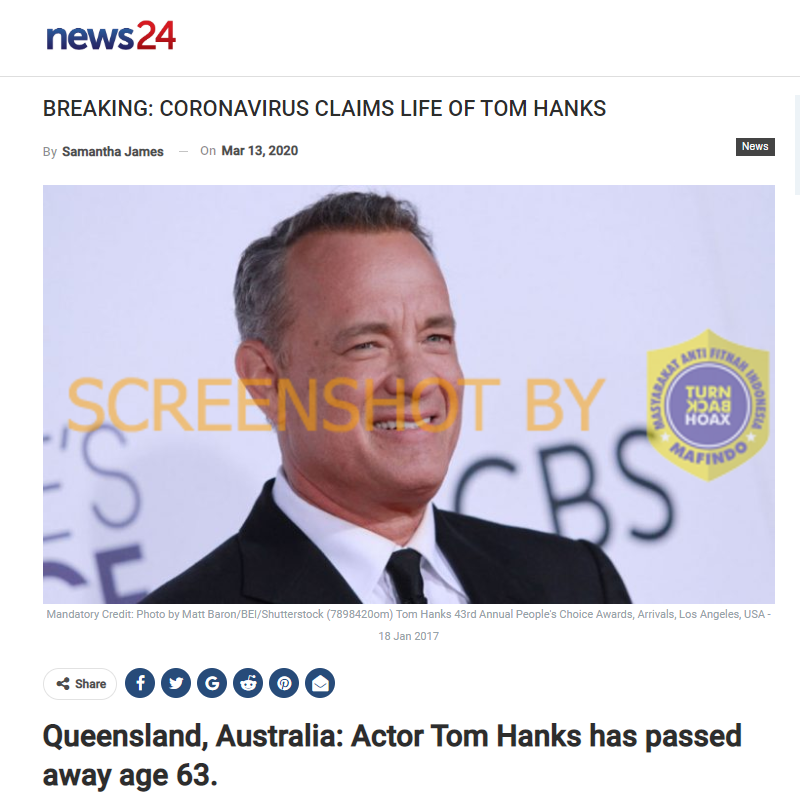 Beredar artikel berjudul “BREAKING: CORONAVIRUS CLAIMS LIFE OF TOM HANKS – Queensland, Australia: Actor Tom Hanks has passed away age 63.”