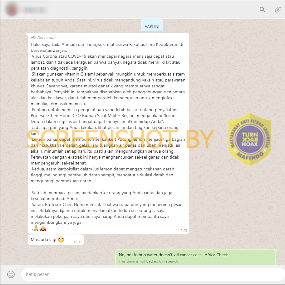 Isu lama beredar kembali dan dikaitkan dengan Covid-19. WHO menyatakan tidak ada bukti bahwa obat saat ini dapat mencegah atau menyembuhkan penyakit. WHO tidak merekomendasikan pengobatan sendiri dengan obat apa pun, termasuk antibiotik, sebagai pencegahan atau penyembuhan untuk COVID-19. Selain itu, klaim bahwa lemon panas dapat membunuh sel kanker adalah klaim yang tidak didukung oleh bukti medis yang kredibel.