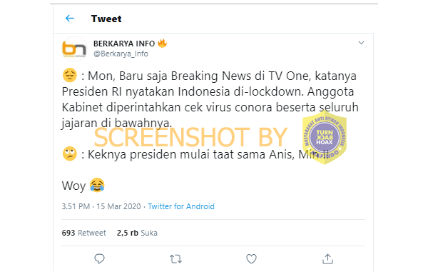 Akun Twitter Berkarya Info atau @Berkarya_Info membuat cuitan yang isinya menyebutkan bahwa katanya Presiden Republik Indonesia (RI) Jokow Widodo atau Jokowi menyatakan Indonesia di-lockdown yang disampaikan pada Breaking News TV One.