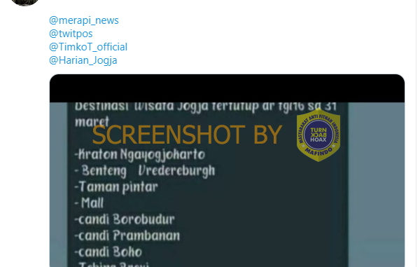 Sebuah akun Twitter membagikan informasi berupa tangkapan layar yang dibarengi dengan narasi bahwa destinasi wisata di Jogja tutup mulai hari ini tanggal 16 – 31 Maret. Pasca dilakukan penelusuran lebih lanjut, Dinas Pariwisata DIY pun melakukan klarifikasi.