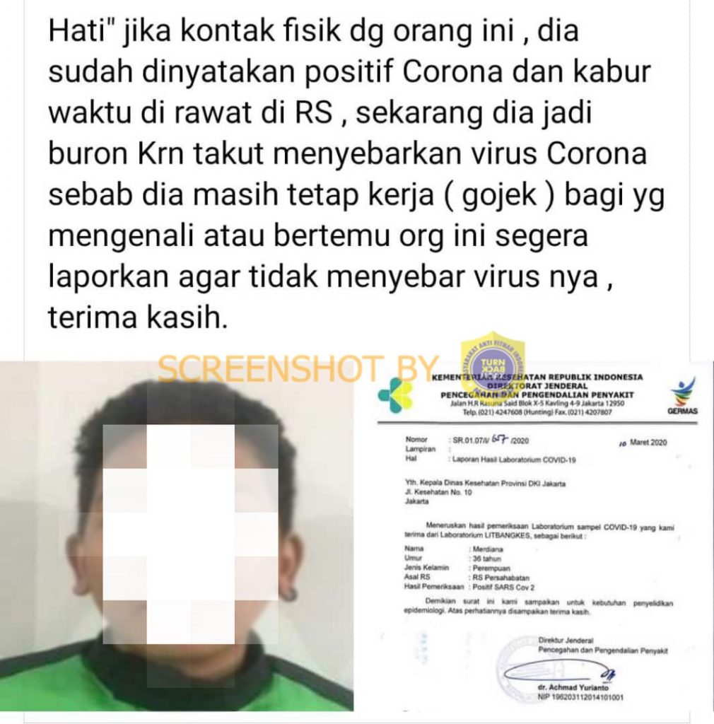 Belum lama ini, beredar informasi di media sosial dan pesan berantai whatsapp foto seorang driver ojek online yang diklaim sebagai suspect virus corona yang kabur dari RS Persahabatan, Jakarta. foto driver ojek online tersebut disandingkan dengan surat laporan hasil lab dari Kementerian Kesehatan.