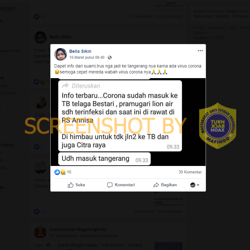“Info terbaru…Corona sudah masuk ke TB telaga Bestari , pramugari lion air sdh terinfeksi dan saat ini di rawat di RS Annisa Di himbau untuk tdk jln2 ke TB dan juga Citra raya Udh masuk tangerang”