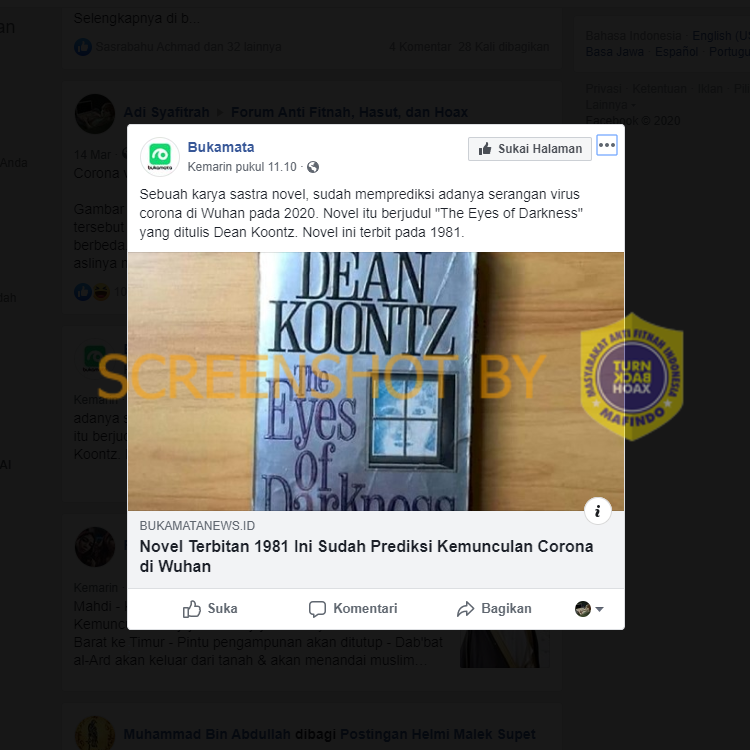 Beredar artikel berjudul “Novel Terbitan 1981 Ini Sudah Prediksi Kemunculan Corona di Wuhan” yang dimuat di situs bukamatanews[dot]id pada Selasa, 17 Maret 2020 08:32.