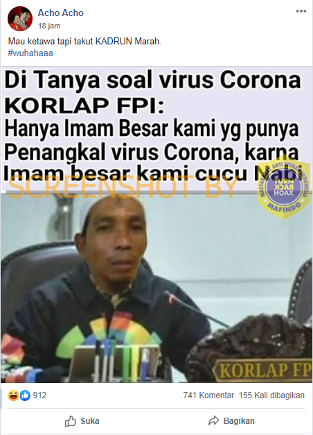 Beredar gambar yang berisikan narasi ”Ditanya soal virus corona korlap FPI: hanya imam besar kami yg punya penangkal virus corona,karna imam besar kami cucu nabi.” Gambar itu beredar melalui Facebook pada Rabu, 18 Maret 2020.