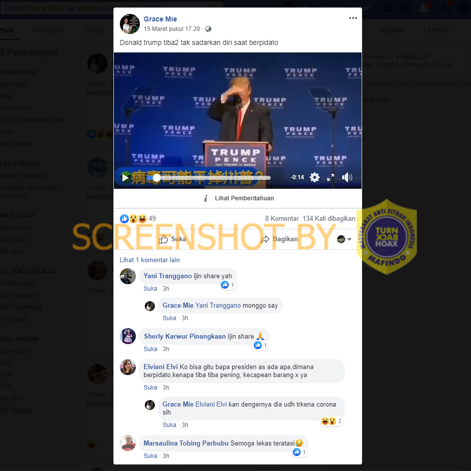 Video tahun 2016 dan tidak terkait dengan virus Corona Covid-19. Saat itupun, Donald Trump yang sedang kampanye di Pusat Konvensi Reno, Nevada juga bukan tiba-tiba tak sadarkan diri, melainkan dilarikan ke luar panggung oleh anggota-anggota Secret Service setelah keributan terjadi di antara hadirin.