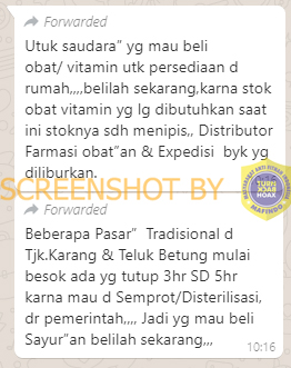 Beredar informasi melalui pesan berantai Whatsapp yang menyatakan akan ada penutupan sejumlah pasar di Tanjung Karang & Teluk Betung, Lampung. Disebutkan dalam pesan tersebut alasan penutupan karena akan dilakukan penyemprotan sterilisasi dari pemerintah. Berikut kutipan narasinya: