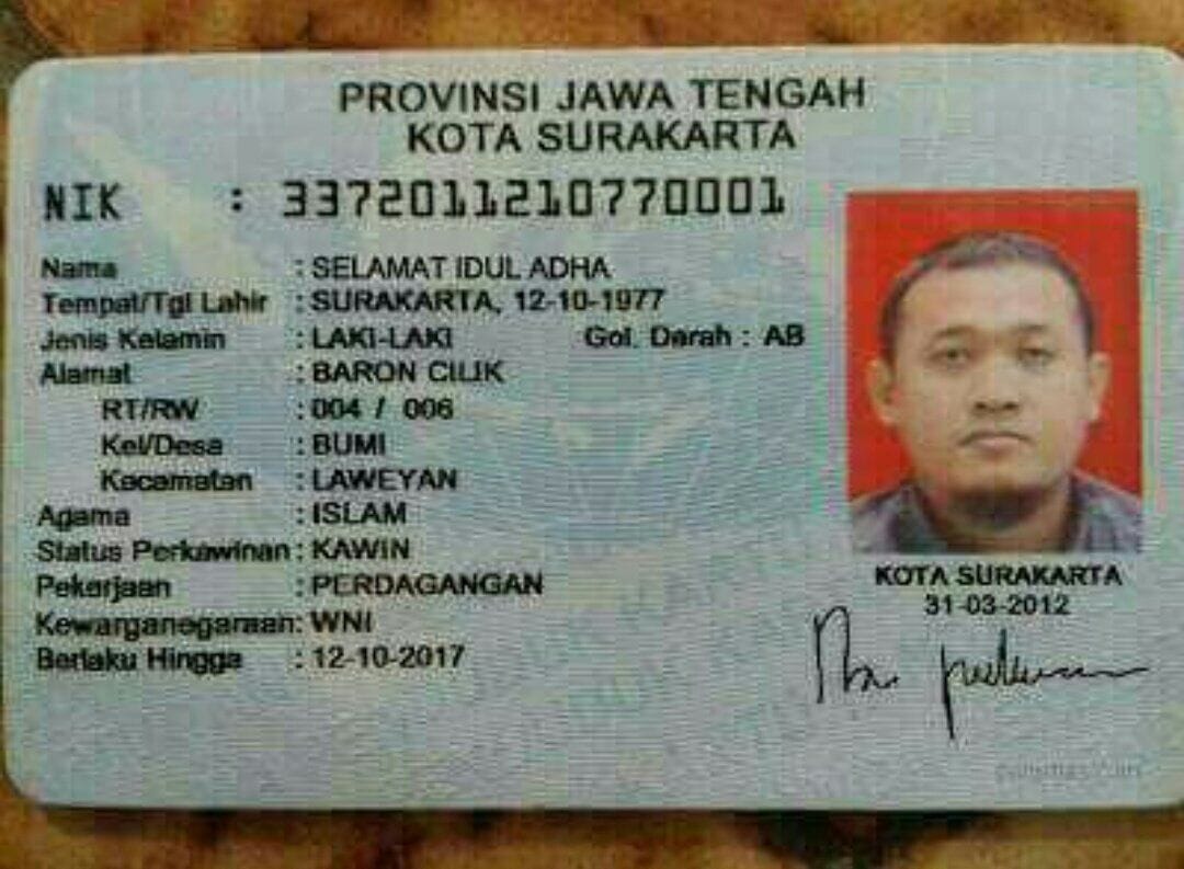 Di Hari Raya Idul Adha ini di berbagai media sosial beredar gambar KTP Elektronik bernama Selamat Idul Adha dengan alamat di Baron Cilik RT04 RW06, Kelurahan Bumi, Kecamatan Laweyan, Solo, Jawa Tengah.