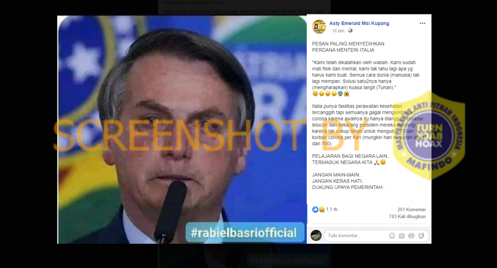 Berdasarkan hasil penelusuran, foto yang diunggah oleh sumber klaim, jika dihubungkan dengan narasi Presiden mereka (Italia) menangis adalah sebuah kesalahan.