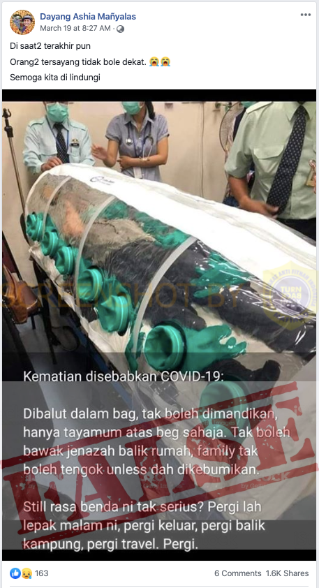 Dibalut dalam bag, tak boleh dimandikan, hanya tayamum atas beg sahaja. Tak boleh bawak jenazah balik rumah, family tak boleh tengok unless dah dikebumikan.
