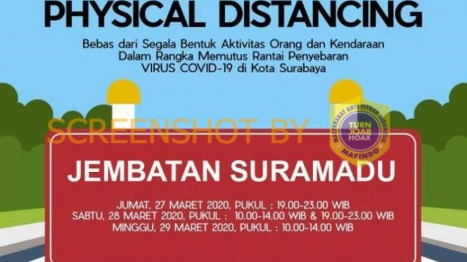Beredar sebuah himbauan perihal penutupan Jembatan Suramadu yang diakibatkan oleh virus corona atau Covid-19. Informasi tersebut beredar melalui media sosial dalam bentuk poster, yang menyatakan jika Jembatan Suramadu masuk ke dalam Kawasan Tertib Physical Distancing dan bebas dari segala bentuk aktivitas orang serta kendaraan.