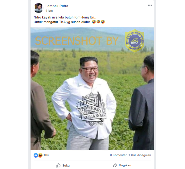 Akun Facebook Lembak Putra atau @putra.lembak.9693 mengunggah foto Presiden Korea Utara (Korut) Kim Jong Un yang nampak di sebuah lahan pertanian dengan beberapa orang yang menghadap dirinya. Dalam foto tersebut, Kim Jong Un mengenakan kemeja bertuliskan “Bersih, Merakyat dan Kerja Nyata”.