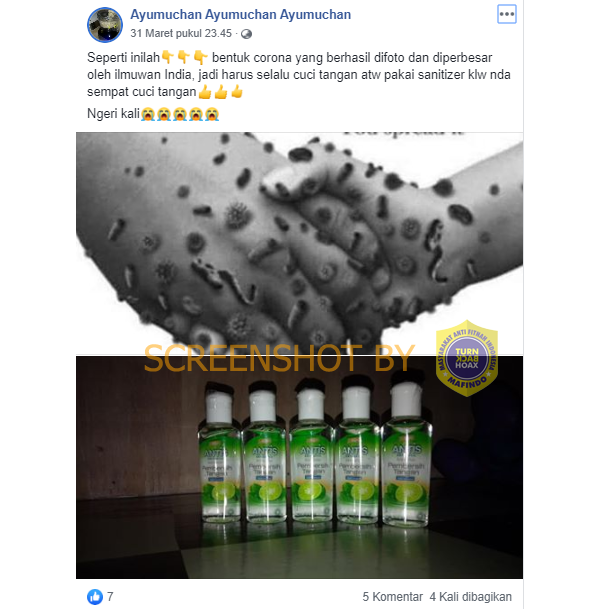 Sebuah akun facebook bernama Ayumuchan Ayumuchan Ayumuchan mengunggah sebuah gambar dimana terdapat foto orang berjabat tangan dipenuhi kuan dan handsanitizer.