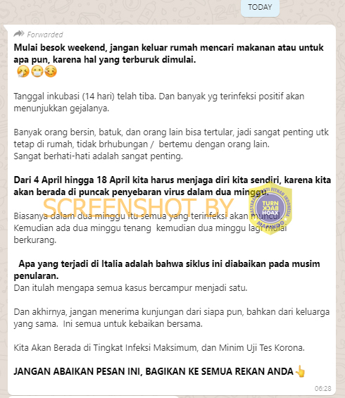 Beredar pesan berantai melalui Whatsapp yang menyebutkan puncak persebaran virus Corona atau wabah COVID-19 ialah pada tanggal 4-18 April 2020. Dalam pesan berantai tersebut juga terdapat sejumlah imbauan. Berikut kutipan narasinya: