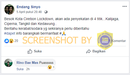 Postingan dari akun Facebook Endang Sinyo diunggah pada 5 April 2020, akun tersebut menarasikan Kota Cirebon dan beberapa titik akan diberlakukan lockdown. Berikut kutipannya: