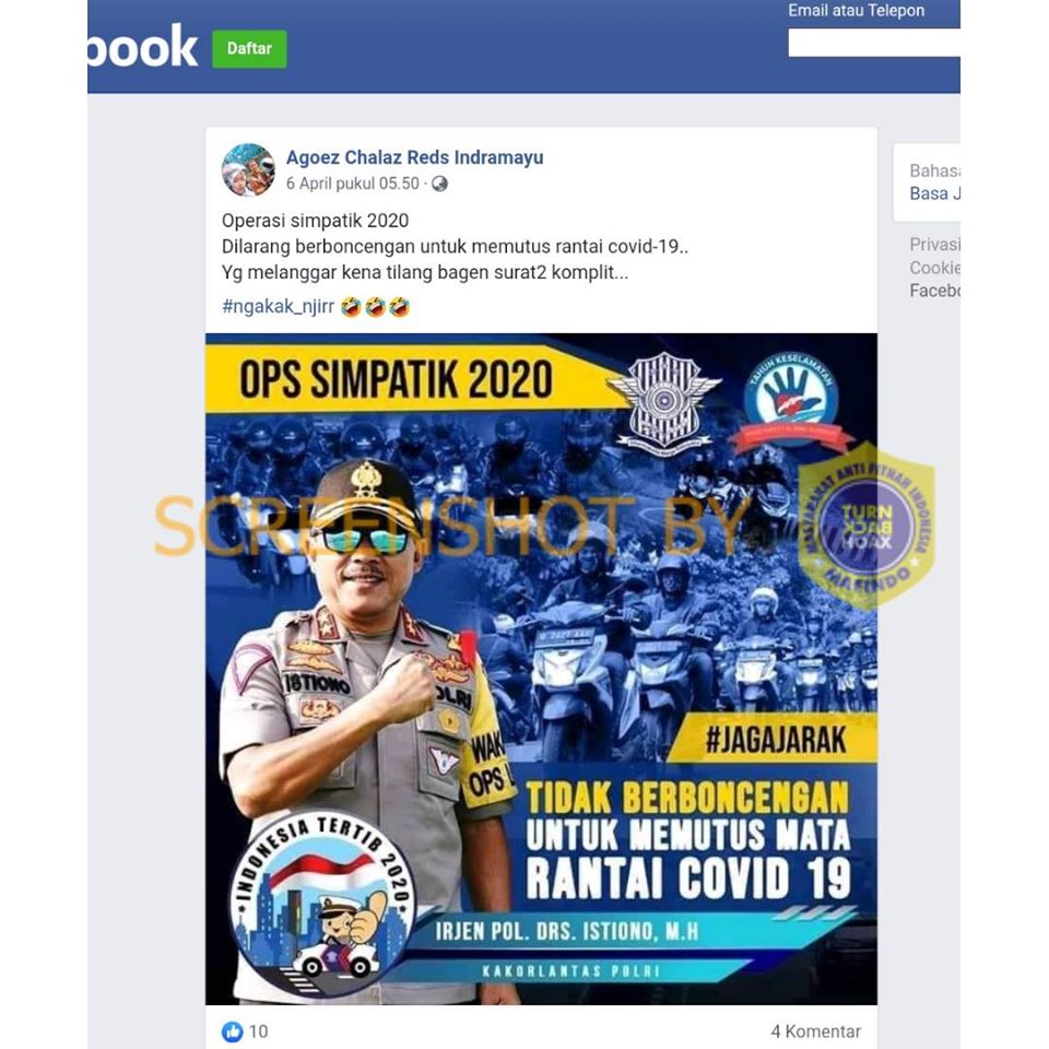 Beredar postingan di akun Facebook Agoes Chalaz Reds Indramayu yang diunggah 6 April 2020. Dalam narasinya operasi simpatik 2020 ini, kalau boncengan dan ketahuan tidak bawa surat lengkap bakal ditilang. Disertai flyer dengan wajah Kakorlantas Polri, Irjen Pol. Drs. Istiono, M.H. dengan memberi himbauan tidak berboncegan untuk memutus rantai penyebaran virus corona, jika melanggar maka akan ditilang.