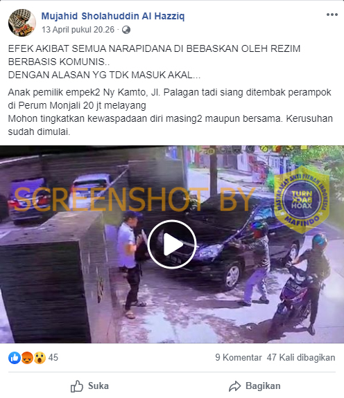 Melalui hasil penelusuran, diketahui informasi yang dibagikan itu keliru. Diketahui bahwa perampokan sebenarnya terjadi di Jl. Sumbawa, RT 34, Kelurahan Thehok, Kecamatan Jambi Selatan, Kota Jambi. Kanit Reskrim Polsek Jambi Selatan Ipda Putu Gede Ega Purwita mengatakan bahwa pelaku perampokan berhasil membawa kabur uang senilai Rp20 juta.
